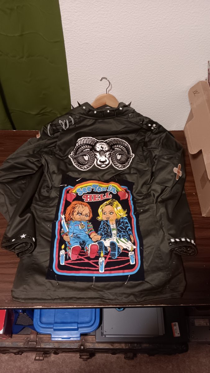 Olive army jacket. Spike shoulders. Chains. Chucky & snake backpiece.