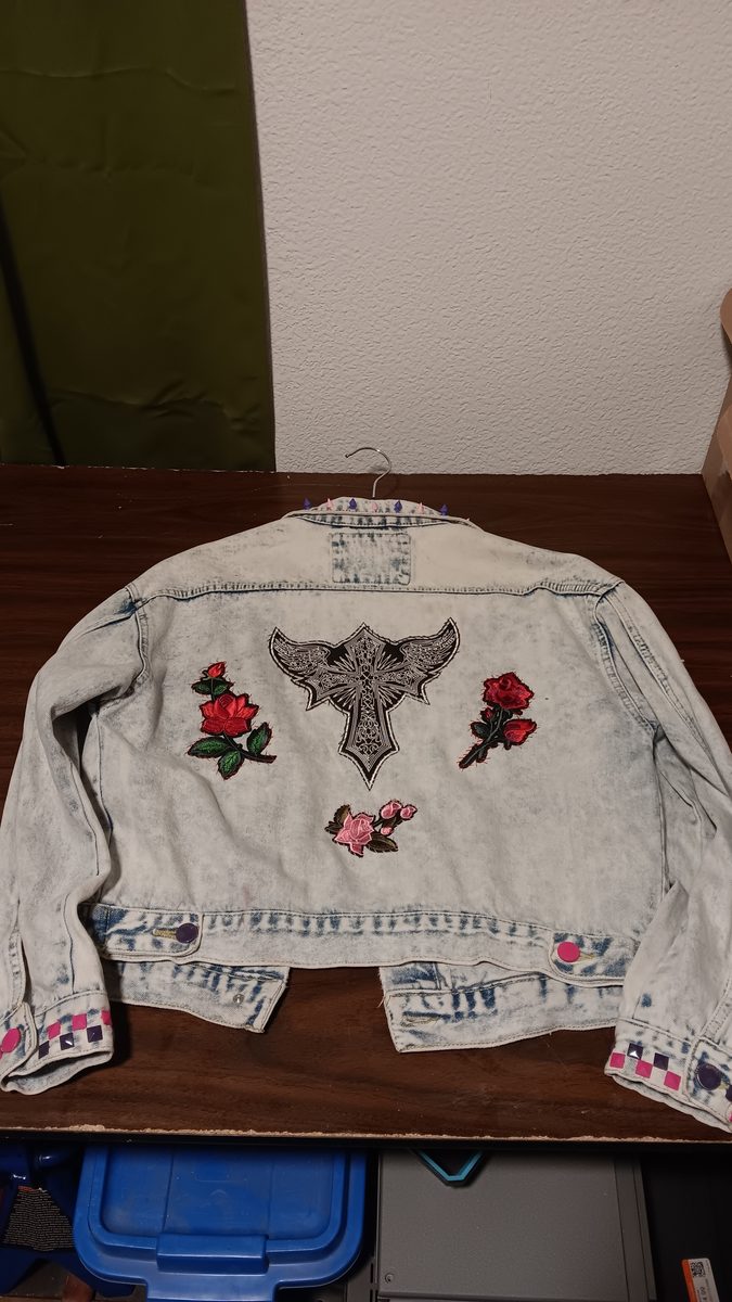 Acid-wash denim. Pink studs. Checkered cuffs. Gothic cross & roses backpiece.